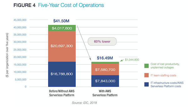 In this article, the author (Lukasz Szymanski) synthesise reports from IDC and Deloitte, and put into perspective the advantage of serverless vs on-prem (regarding infrastructure & operations costs but also downtime and productivity).