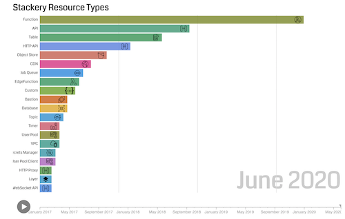 This small article provides an animated graph of resource provisioning (through stackery) from 2017 to today. Without any surprise, main resources are Lambda functions, API Gateway, DynamoDB tables, the standard serverless trio. An interesting point is the massive adoption of API Gateway HTTP API, and it will probably overcome API Gateway REST API soon.