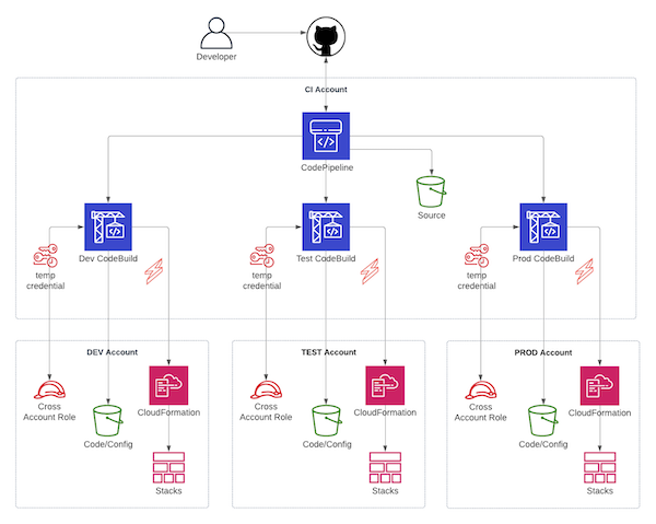 I've been asked several times by my customers: "Is it possible to have a cross-account CI/CD pipeline to deploy on several environments?" Of course it is, and this article explains how, in particular how they use SSM to store the role arn to use according to the target environment. Bonus: build notifications in Slack, packages saved to CodeArtifact and automated tests. Really detailed article, plus the code available in github.