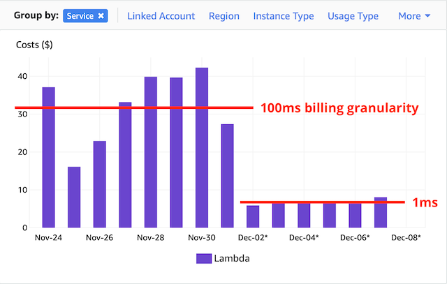 Another great news for all Lambda users, and a great argument for everyone yelling about vendor lock-in and cost-increase. Lambda is now billed per millisecond instead of 100 ms increments. It probably won't be a huge drop in most bills but noticeable if your function is invoked millions of times per month.